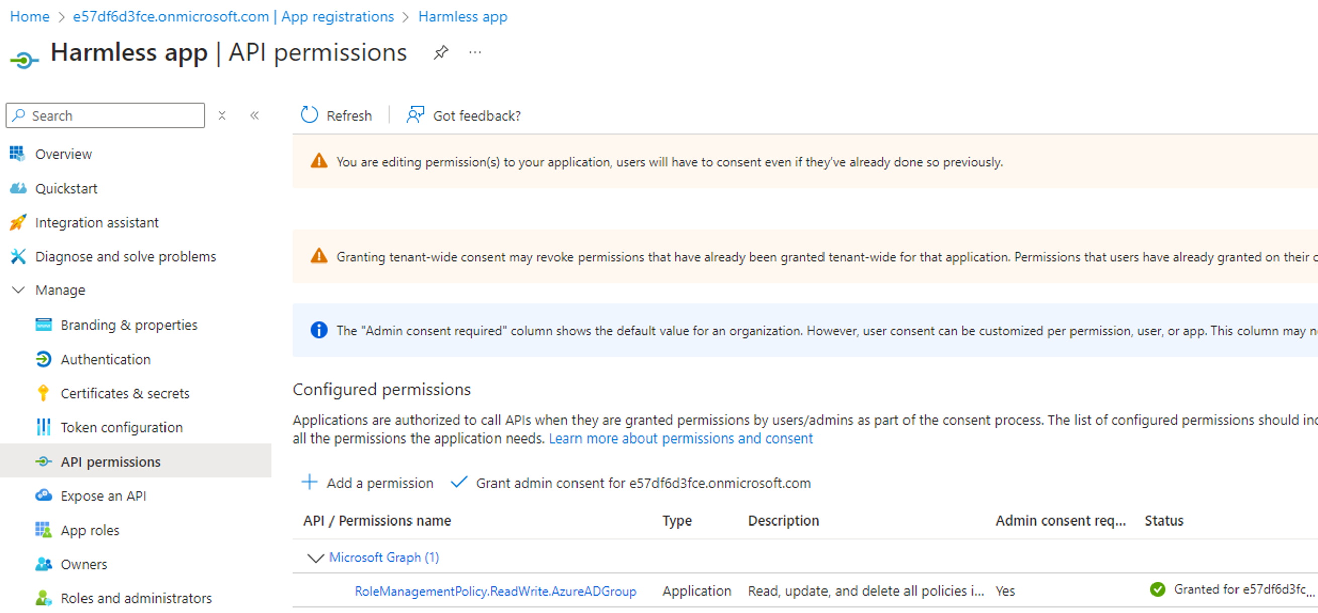 In scenarios where a targeted group is governed by a strict role management policy, the discussed privilege escalations might not be possible, and will require to be combined with the RoleManagementPolicy.ReadWrite.AzureADGroup permission, in order to be successful.